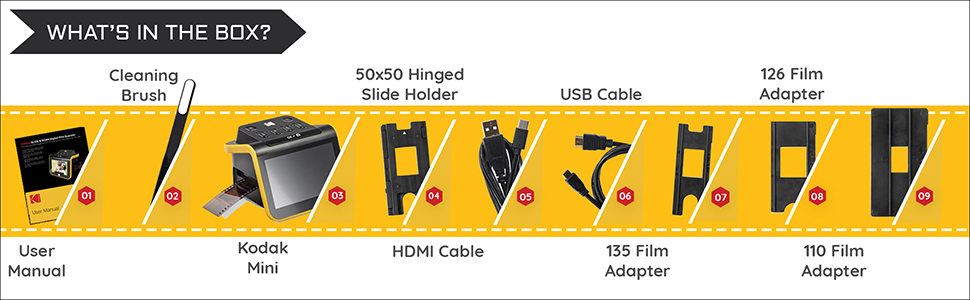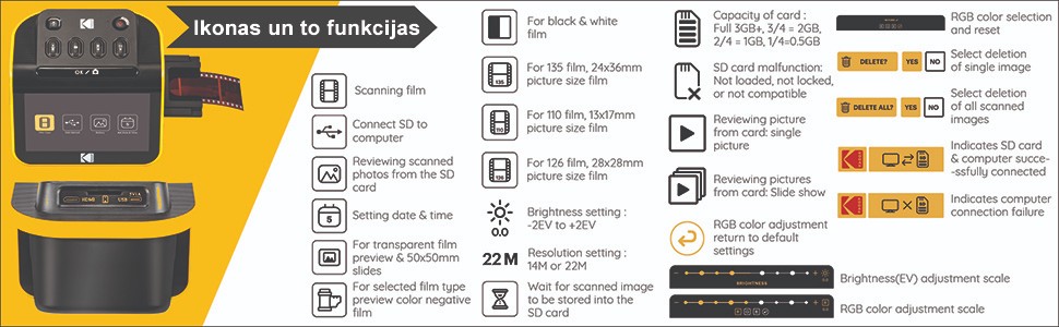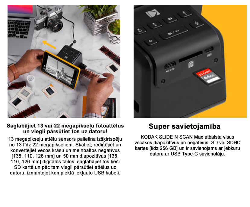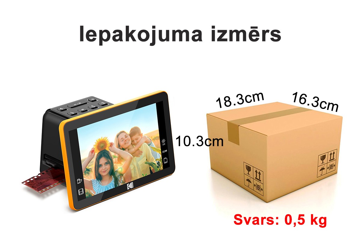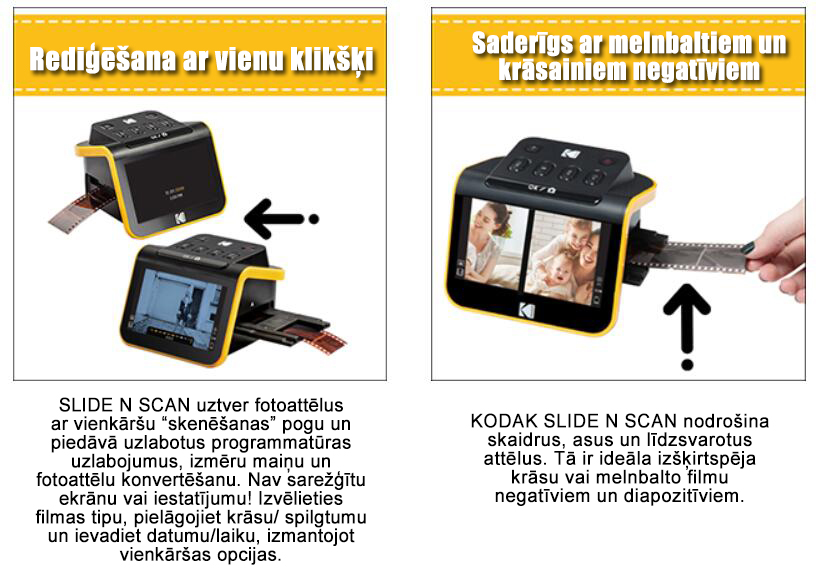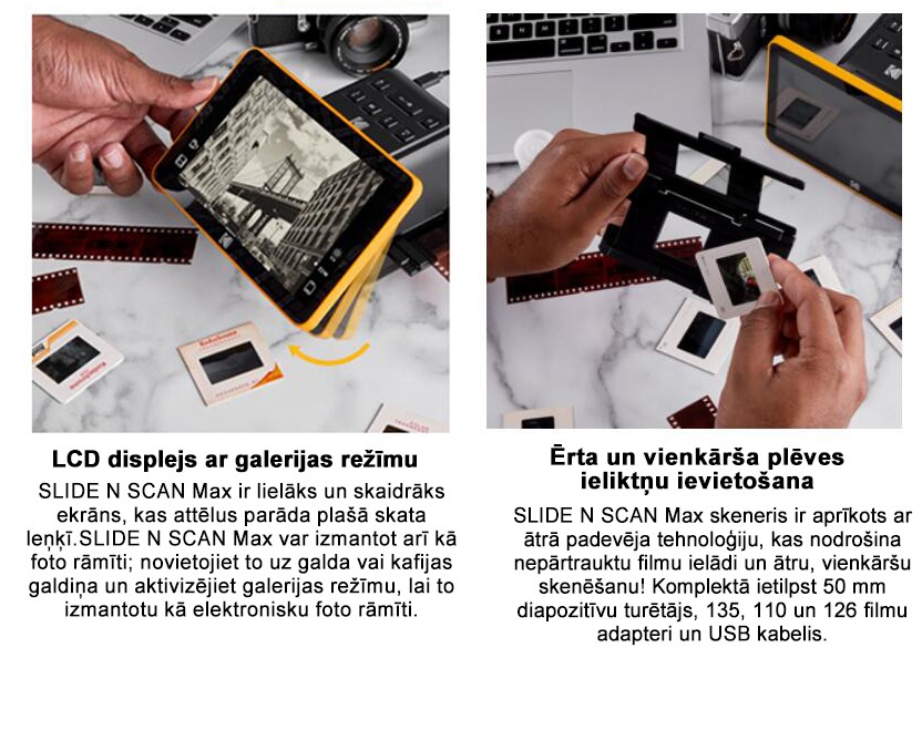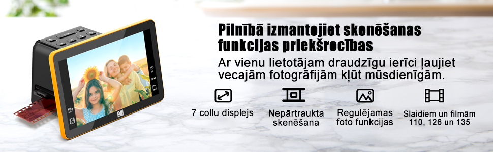KODAK digitālo filmu skeneri, filmu un diapozitīvu skeneri, kas 35 mm, 126 mm, 110 mm krāsu un melnbaltos negatīvus un diapozitīvus pārvērš augstas izšķirtspējas, 22 megapikseļu JPEG formāta digitālās fotogrāfijās.